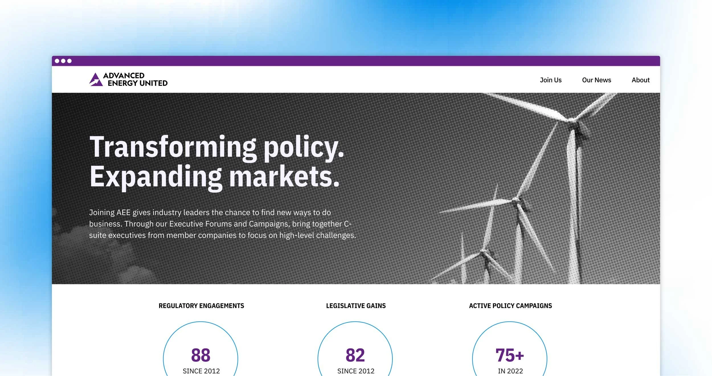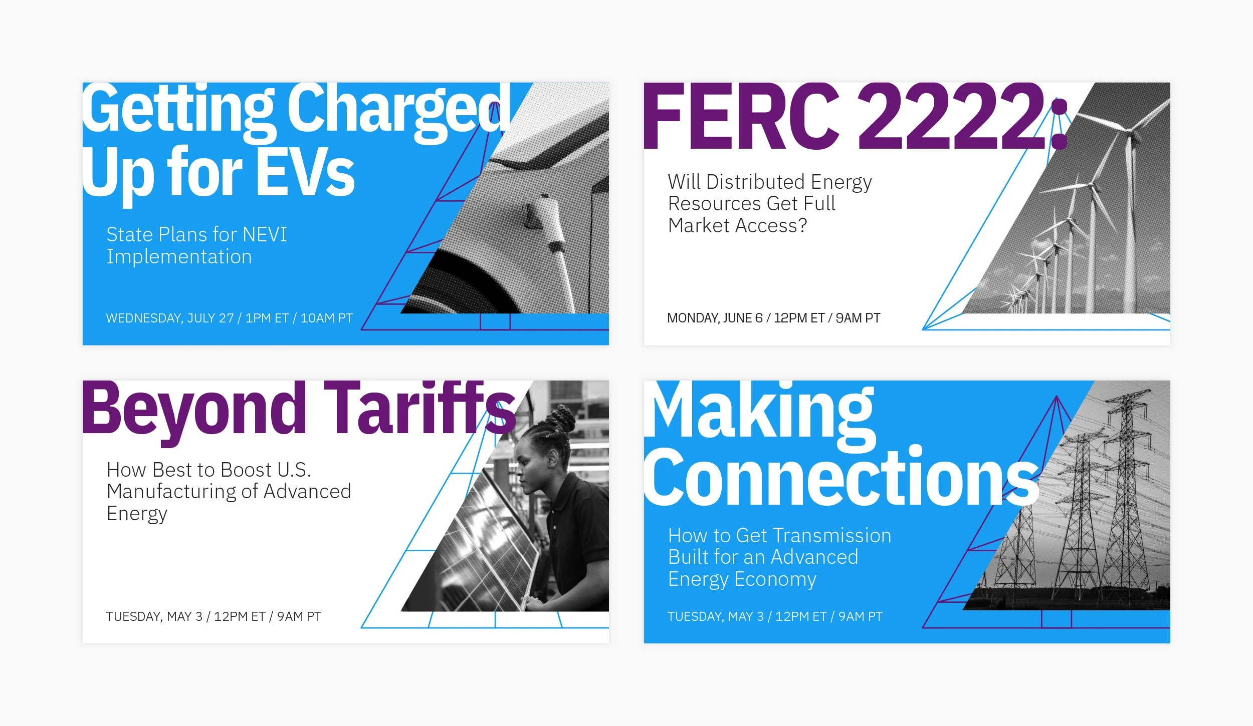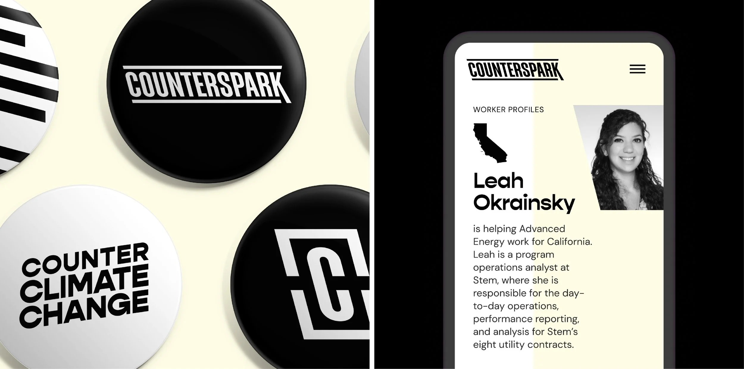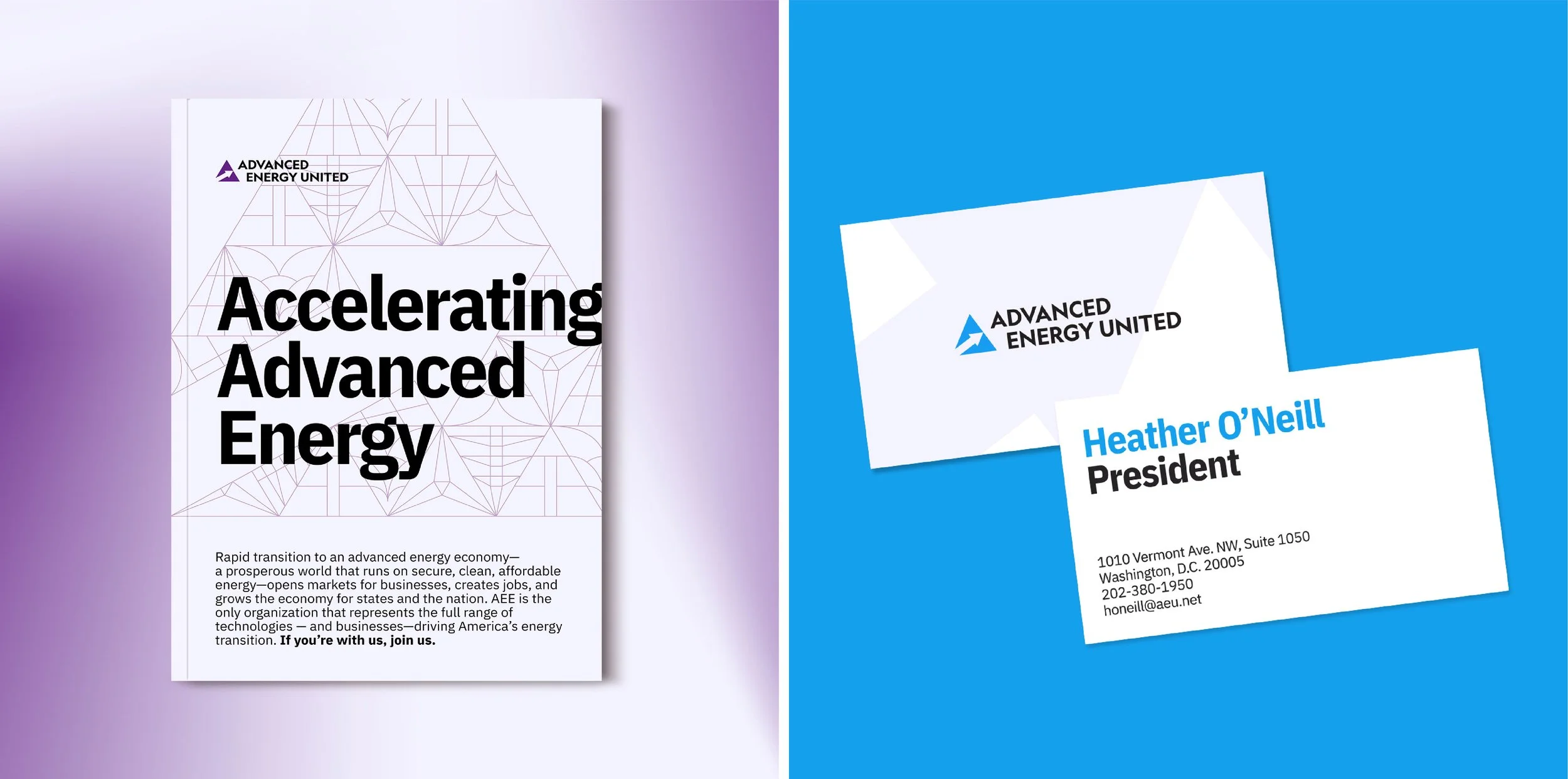 Advanced Energy United is the leading business guild for clean energy companies across the U.S., providing its members with robust research resources to make the case to state governments and communities for the environmental and economic benefiits of going green. Counterspark is the guild's 501c4 advocacy arm (formerly Advanced Energy Works). I led not only the visual design to rebrand AEU and all of its entities, but I also led the creative process to rename the 501c4, to reenvision the overarching organization's brand architecture, and to develop tone & voice guidelines and messaging pillars.