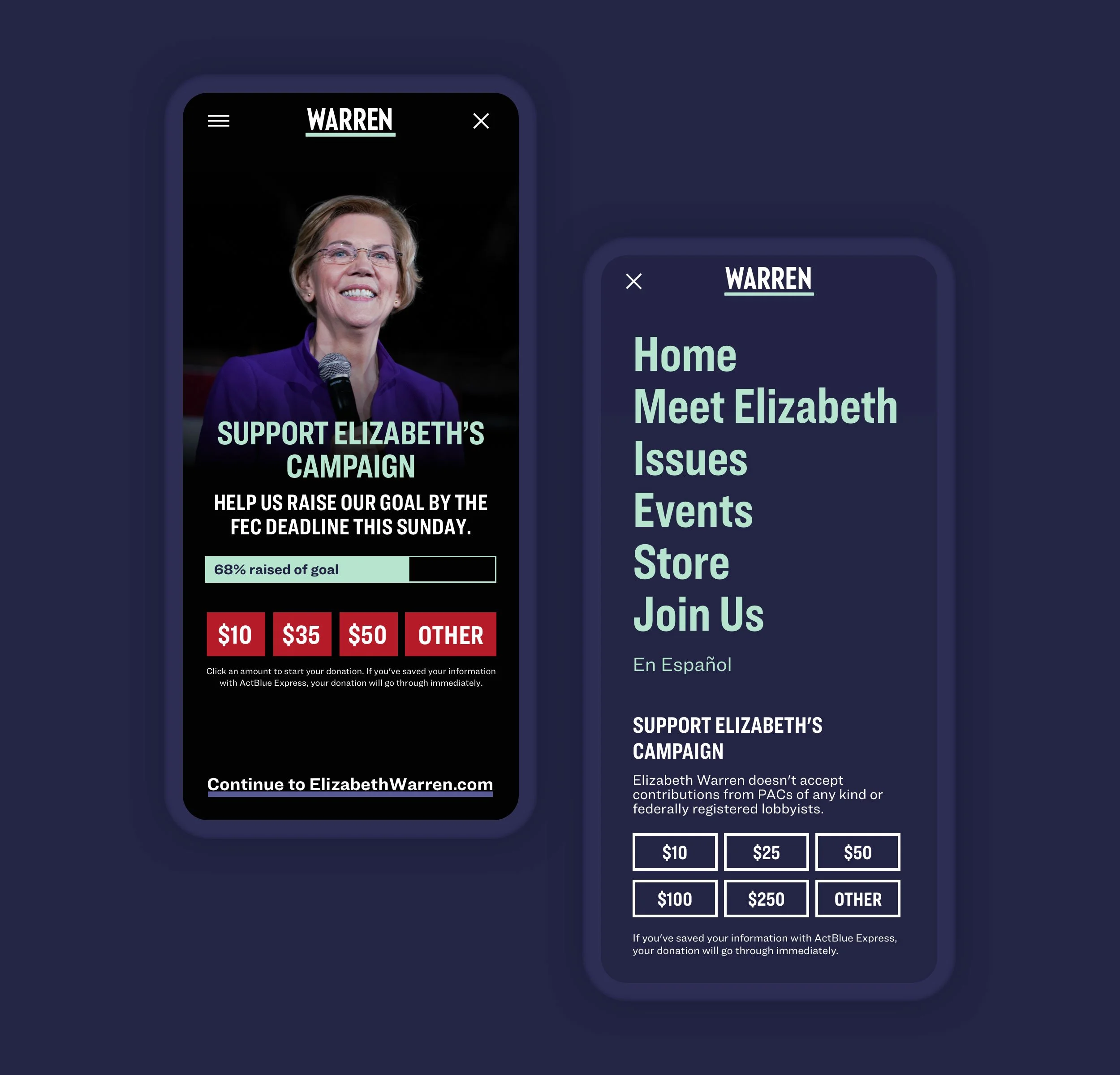 I was instrumental in shaping the foundation of Elizabeth Warren’s campaign visual identity in collaboration with Blue State’s Executive Creative Director, Matt Ipcar. I contributed to the development of the logo, was responsible for defining the Warren typographic and color system, designed the campaign’s launch site, created collateral and merchandise, and helped steer brand consistency as the campaign staffed up internally.